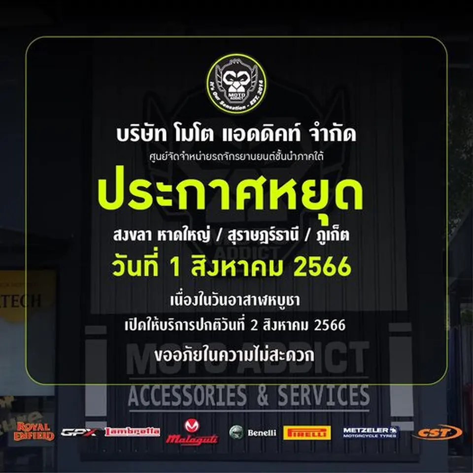 บริษัท โมโต แอดดิคท์ จำกัด ศูนย์จัดจำหน่ายรถจักรยานยนต์แบรนด์ชั้นนำ เเละศูนย์บริการหลังการขายครบวงจร ขอประกาศแจ้งปิดทำการทั้ง 3 สาขา [...]